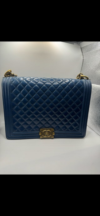 Authentic Chanel Boy Bag Blue Quilted Leather with Gold Chain