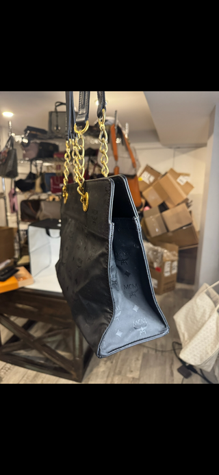 Authentic MCM Black Monogram Nylon Tote with Gold Chain Handles