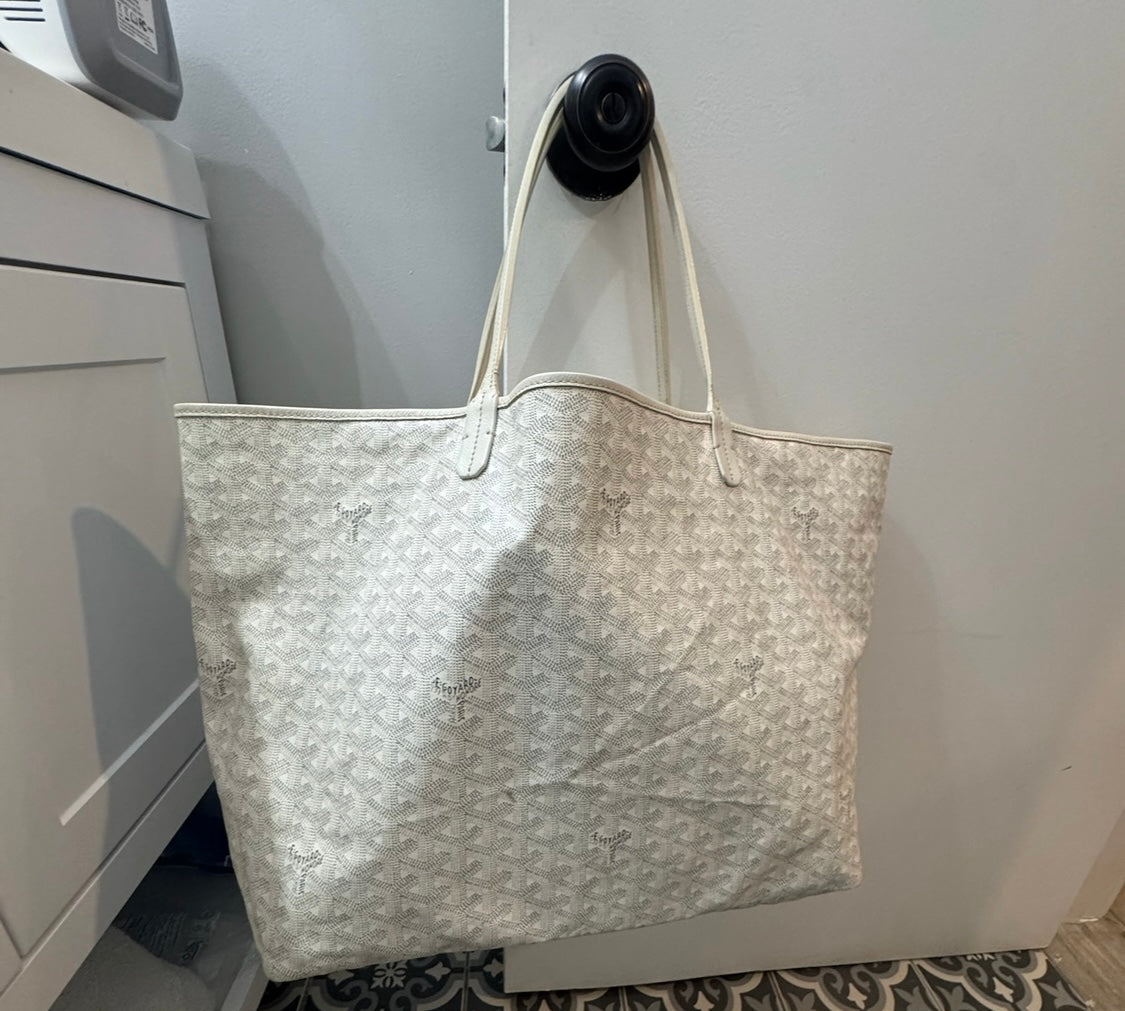 authentic Goyard St. Louis GM Tote in classic white. Crafted from Goyard’s signature hand-painted Goyardine coated canvas with smooth leather trim, this oversized tote is both lightweight and durable. The spacious GM size makes it perfect for travel, work, or daily use, and it includes the detachable matching pouch for added versatility.