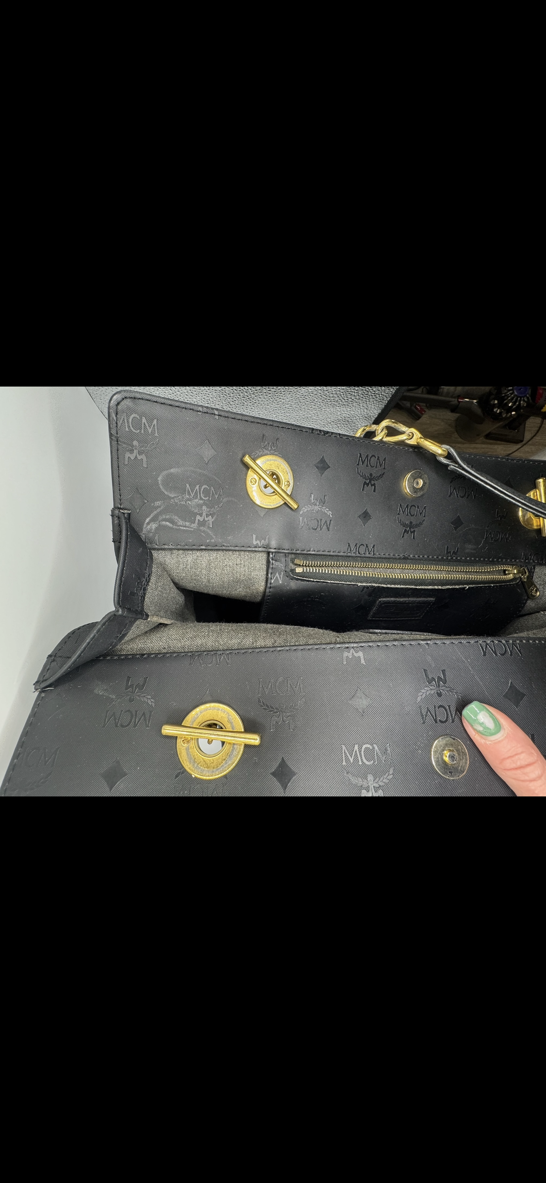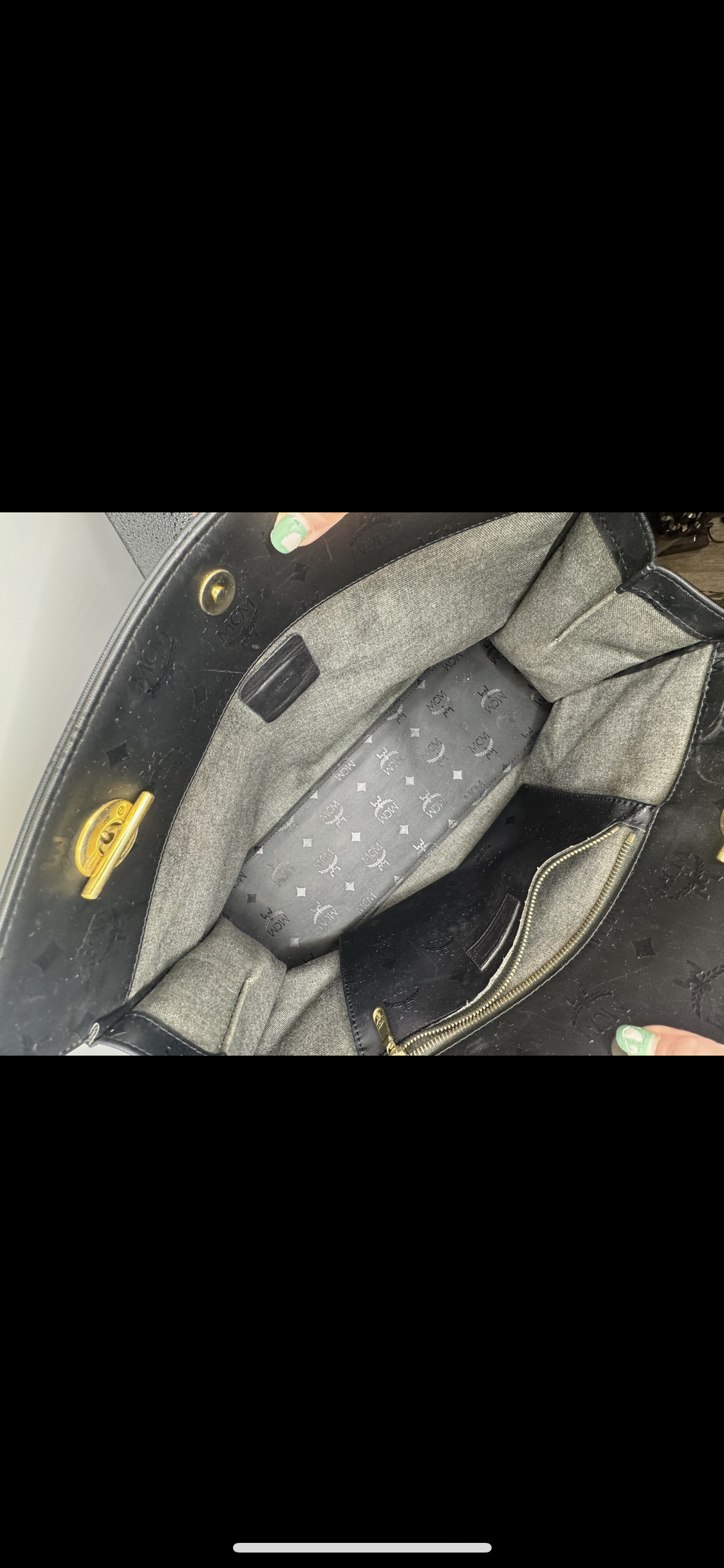 This authentic MCM tote bag is a timeless everyday carry, crafted in durable black nylon with the signature MCM monogram print. Featuring luxe gold-tone chain and leather shoulder straps, a spacious interior with zip and slip pockets, and secure turn-lock closures, this tote combines practicality with chic sophistication. Perfect for daily use, work, or travel, it offers both style and function.