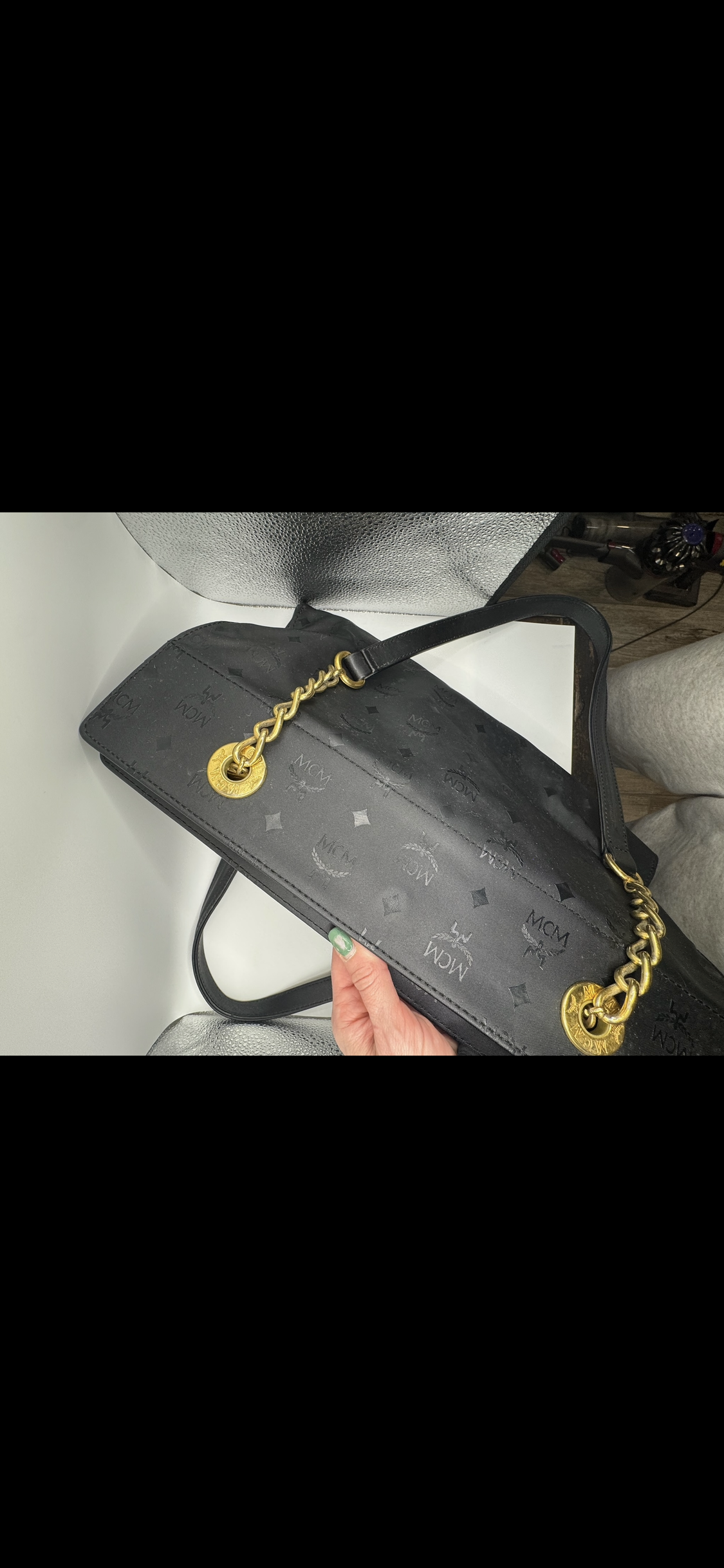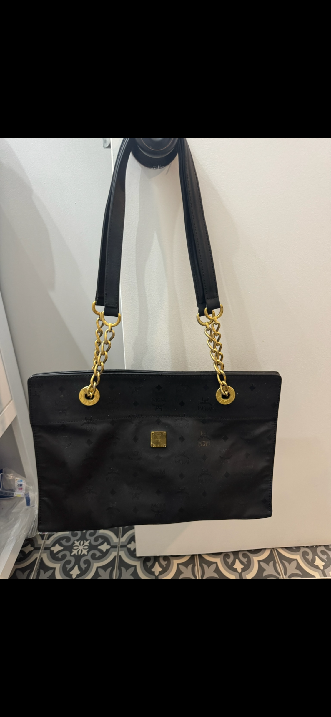 Authentic MCM Black Monogram Nylon Tote with Gold Chain Handles