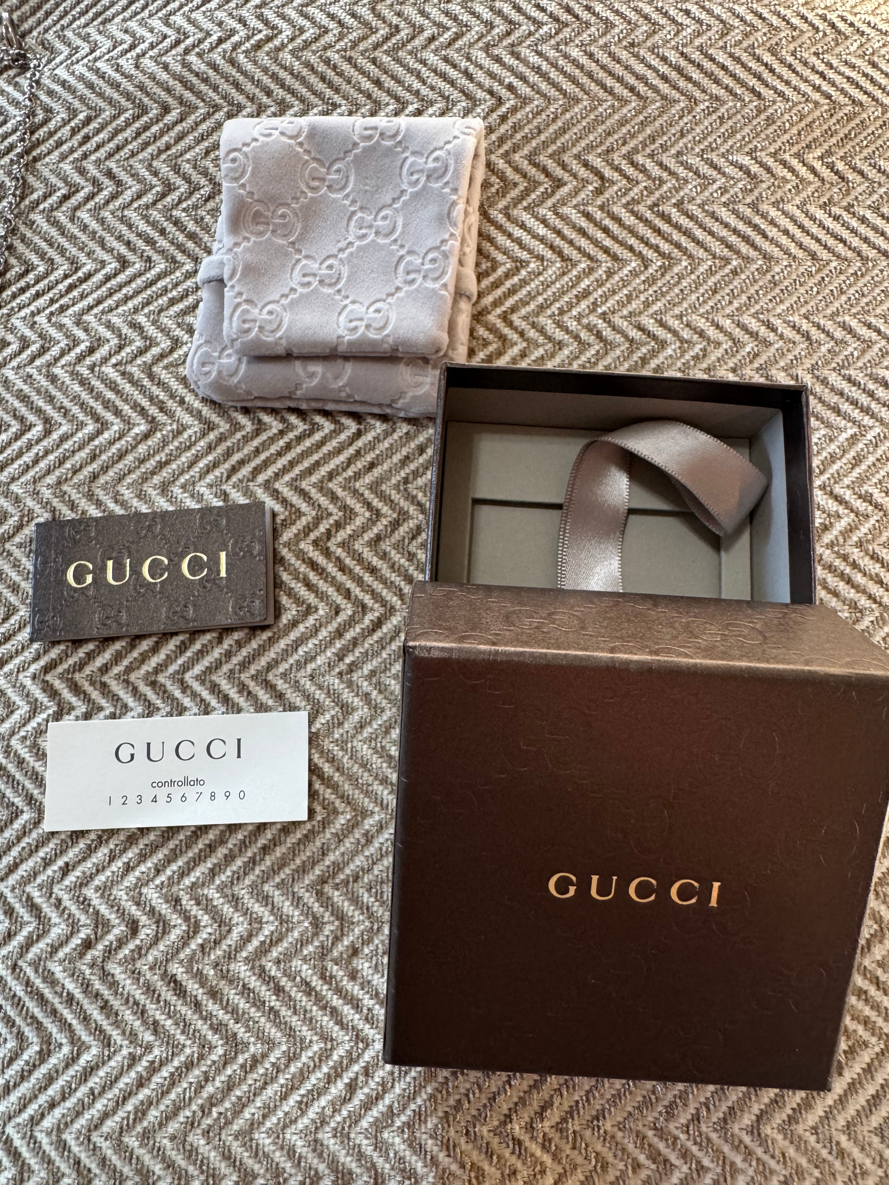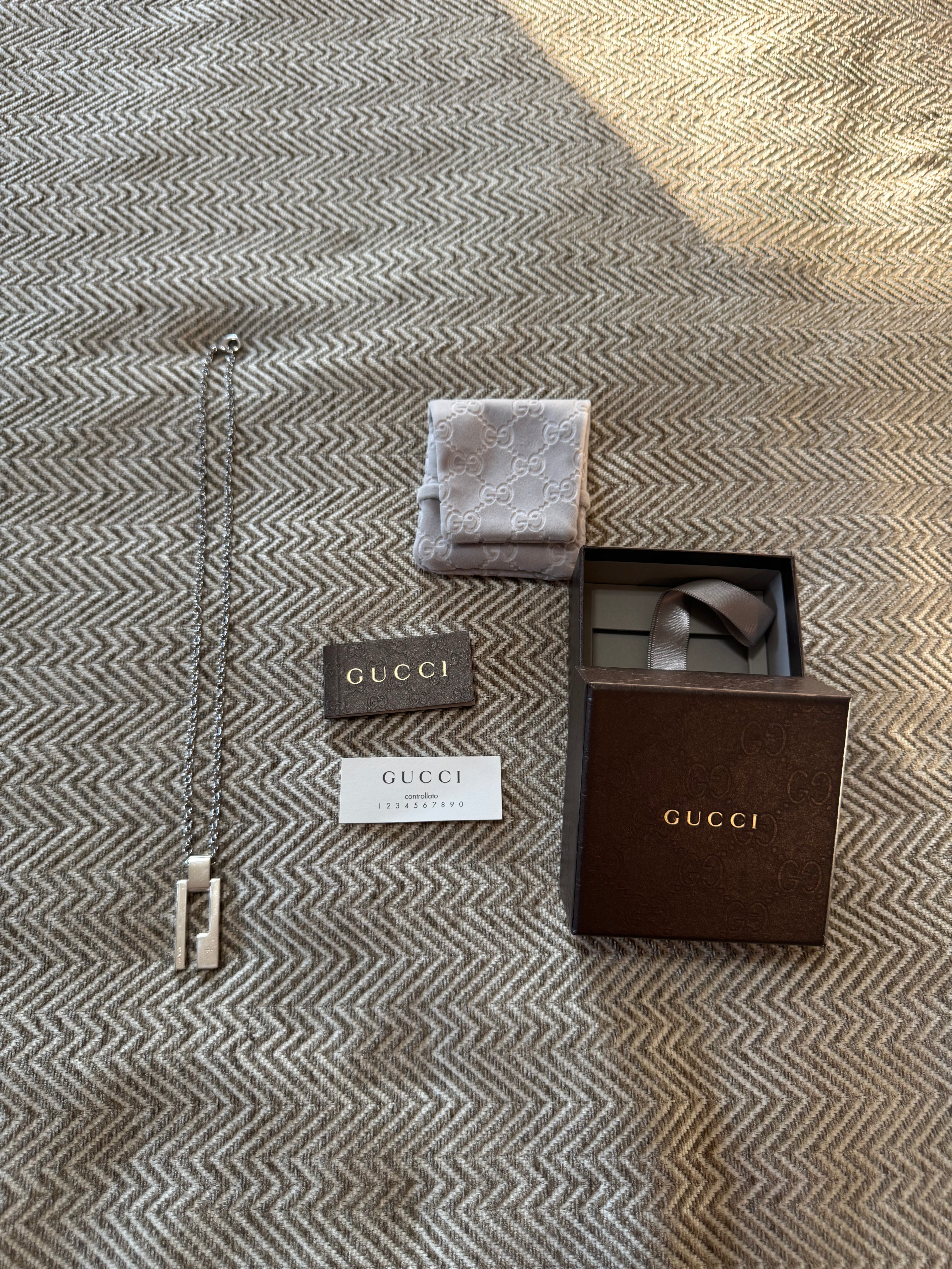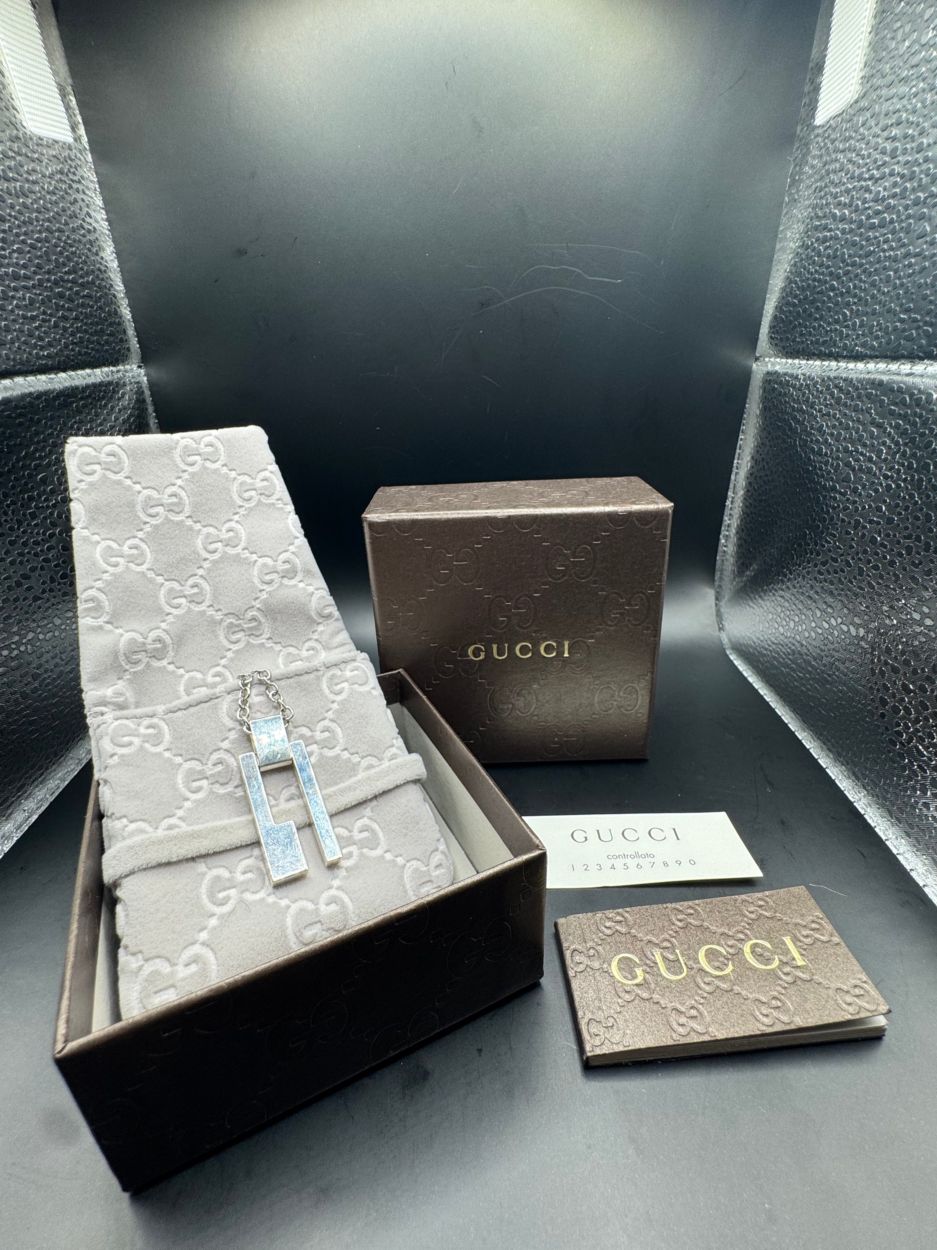 Elegant Vintage Gucci pendant necklace. Sleek silver design. Perfect for any occasion.
