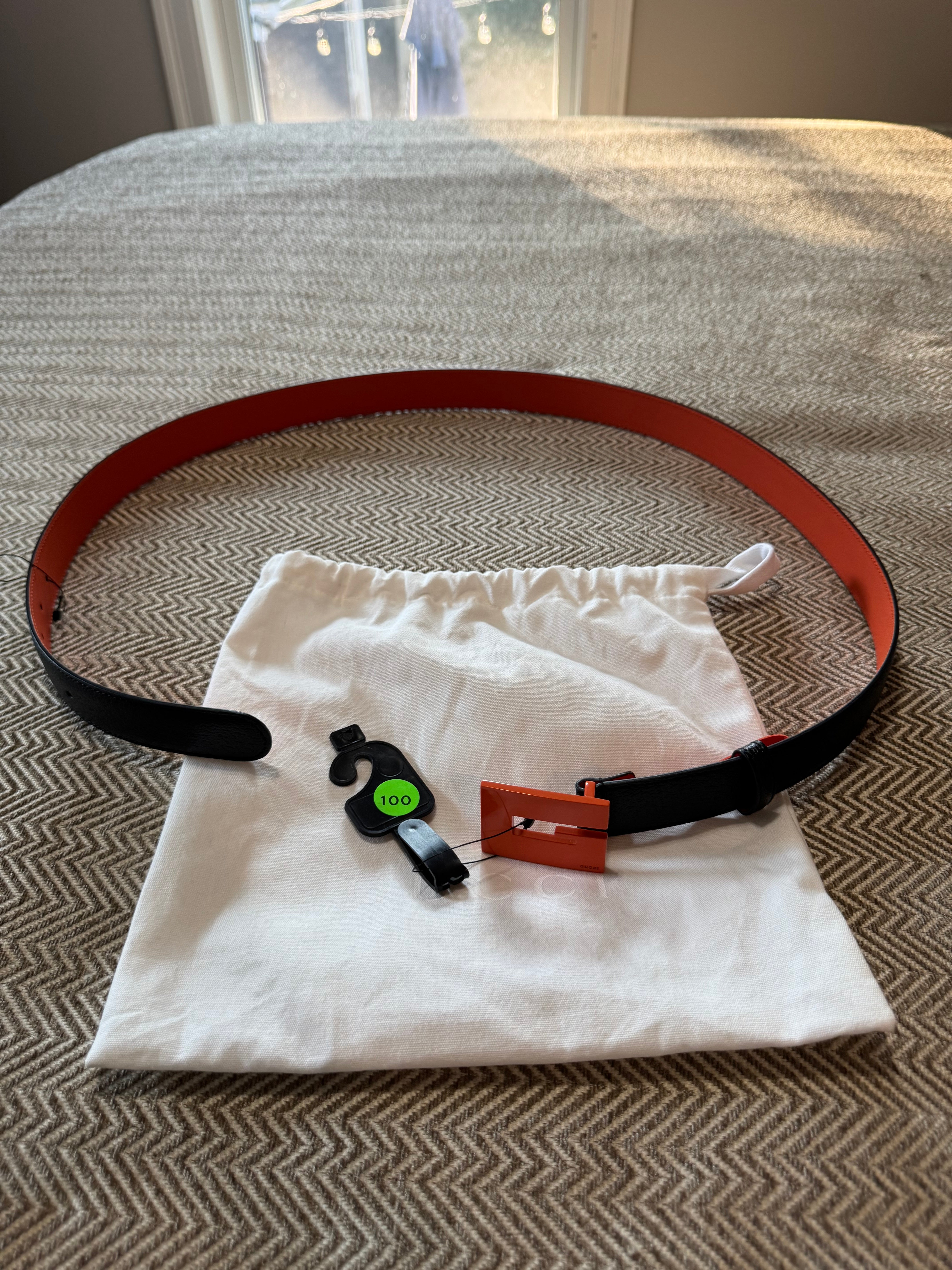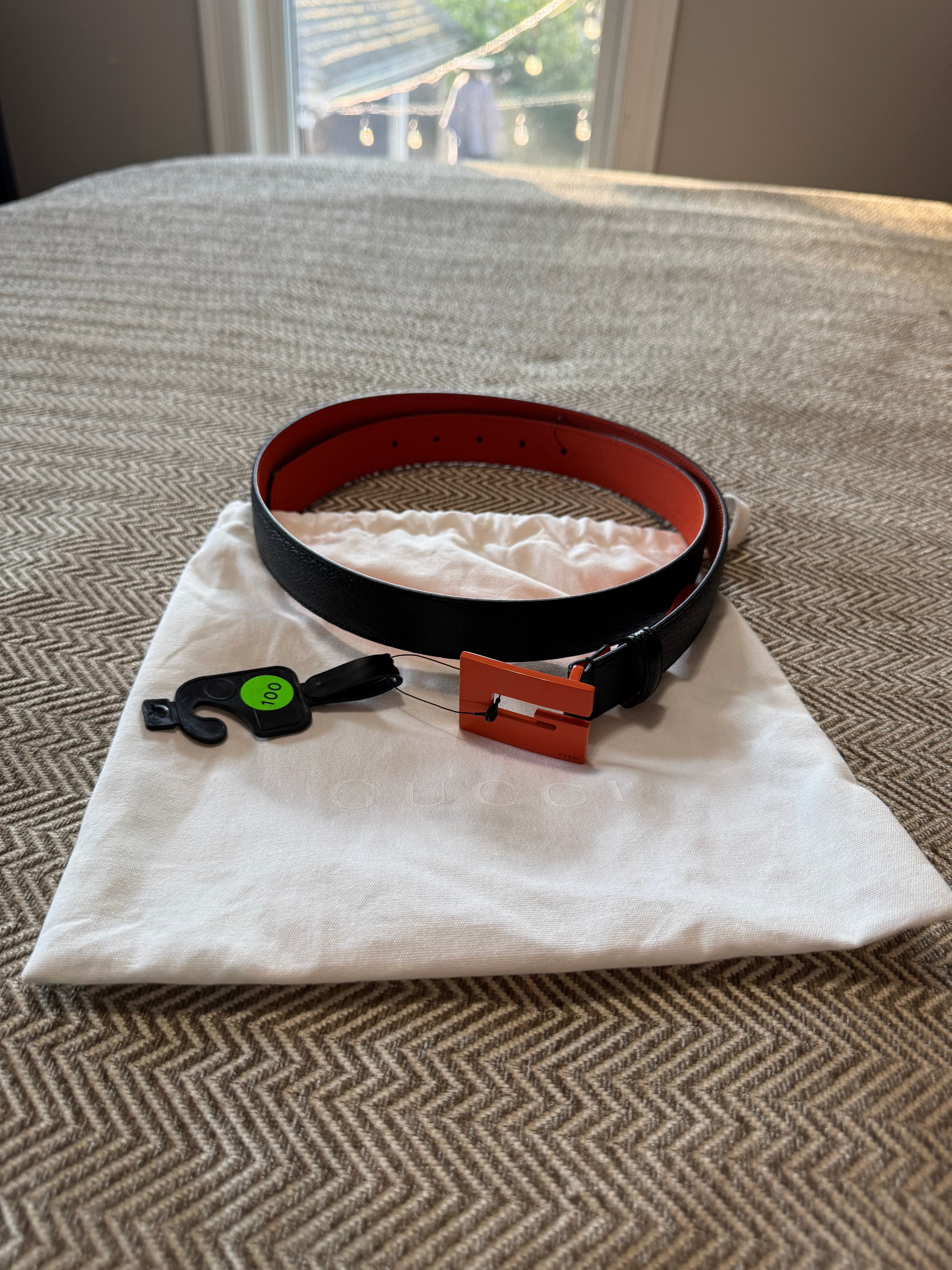 Elevate your style with this Gucci belt, featuring a striking black exterior complemented by a vibrant orange interior. Crafted from premium materials, this accessory is perfect for adding a touch of luxury to any ensemble. The belt's unique design and high-quality craftsmanship make it a standout piece in any wardrobe.