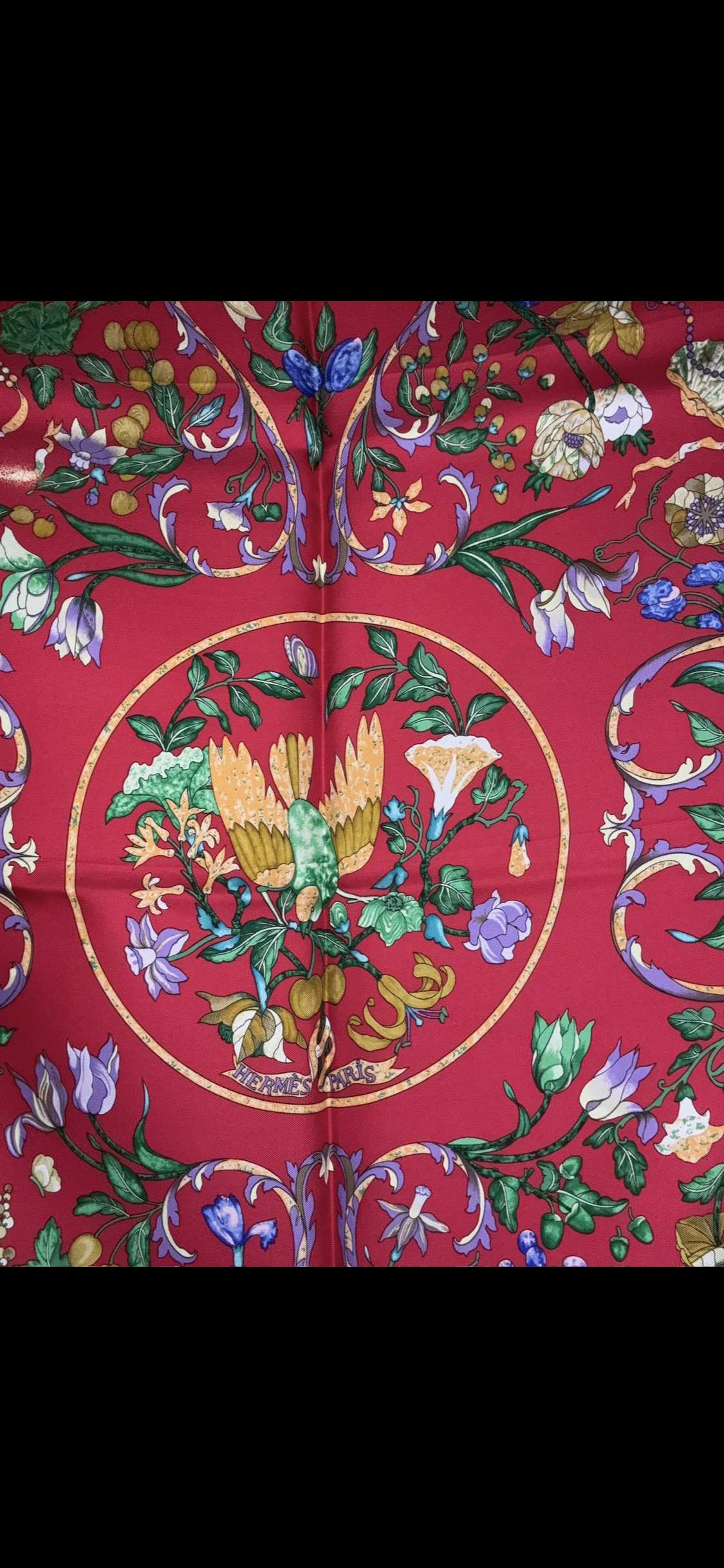A true Hermès treasure, the “Pierres d’Orient et d’Occident” Carré 90 is one of the Maison’s most celebrated designs, showcasing vibrant birds, florals, and gemstone-inspired motifs in a bold red, blue, and green palette. Crafted in France from 100% silk, this square scarf highlights the exquisite artistry and luxurious heritage of Hermès.
