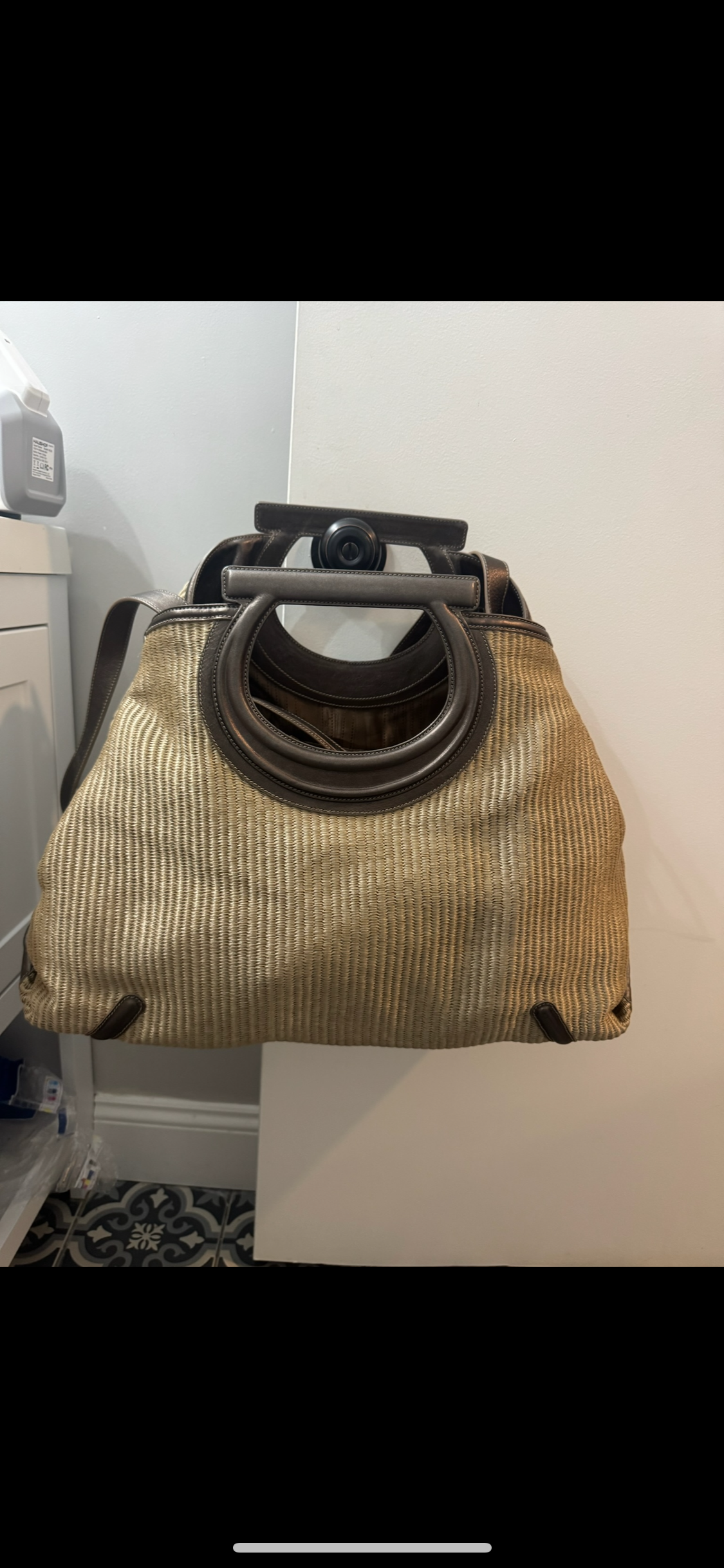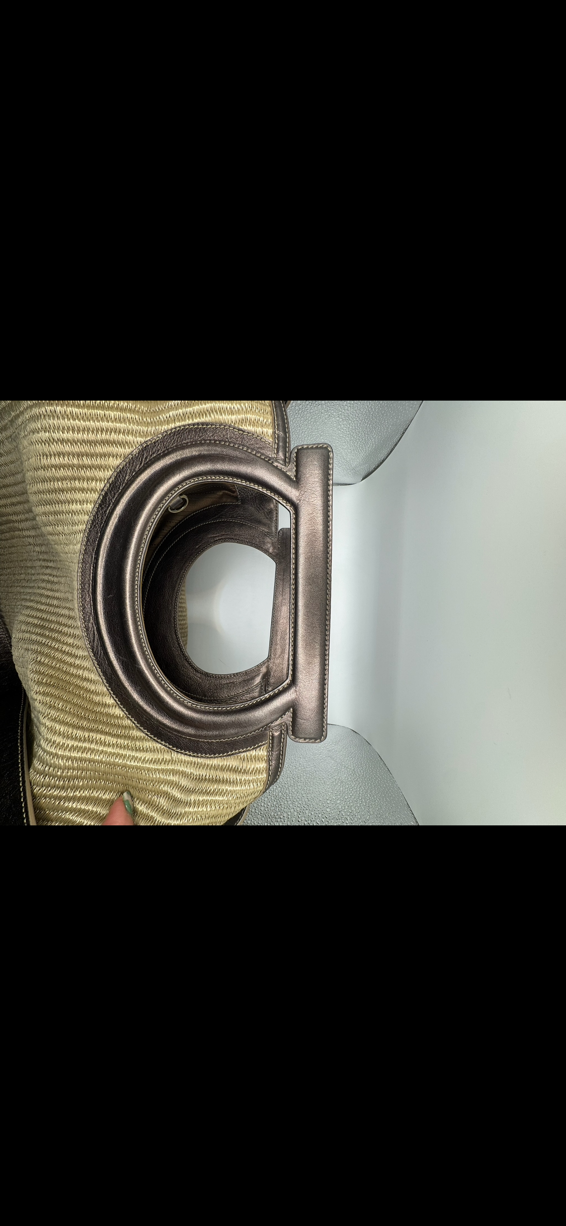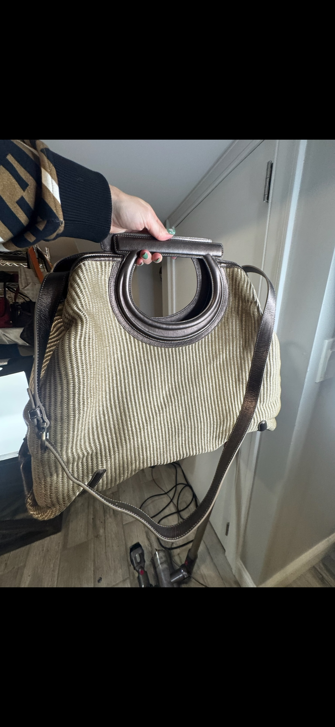 - Material: Woven canvas body with genuine leather trim & circular Gancini-inspired handles