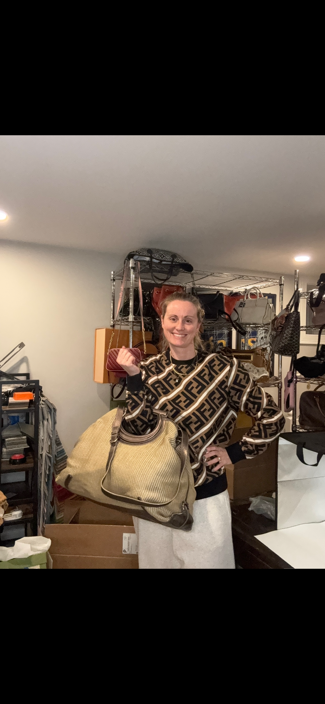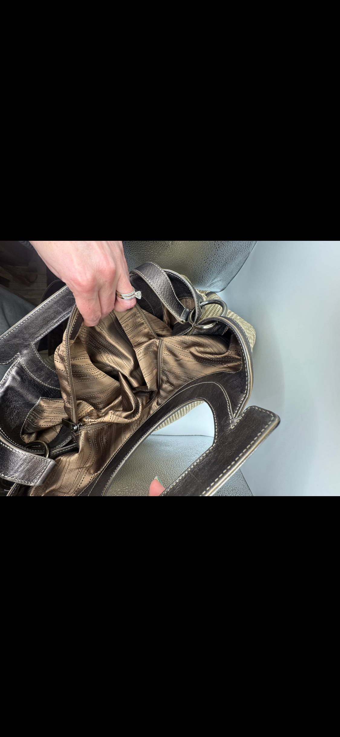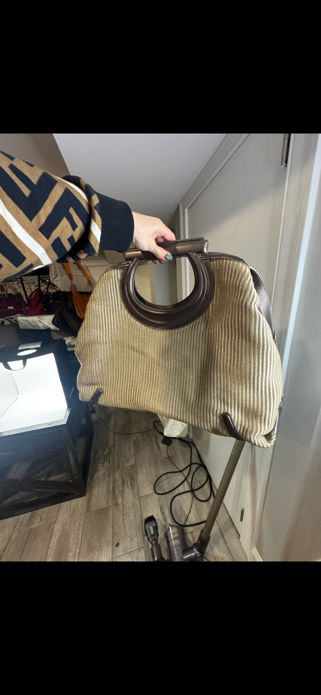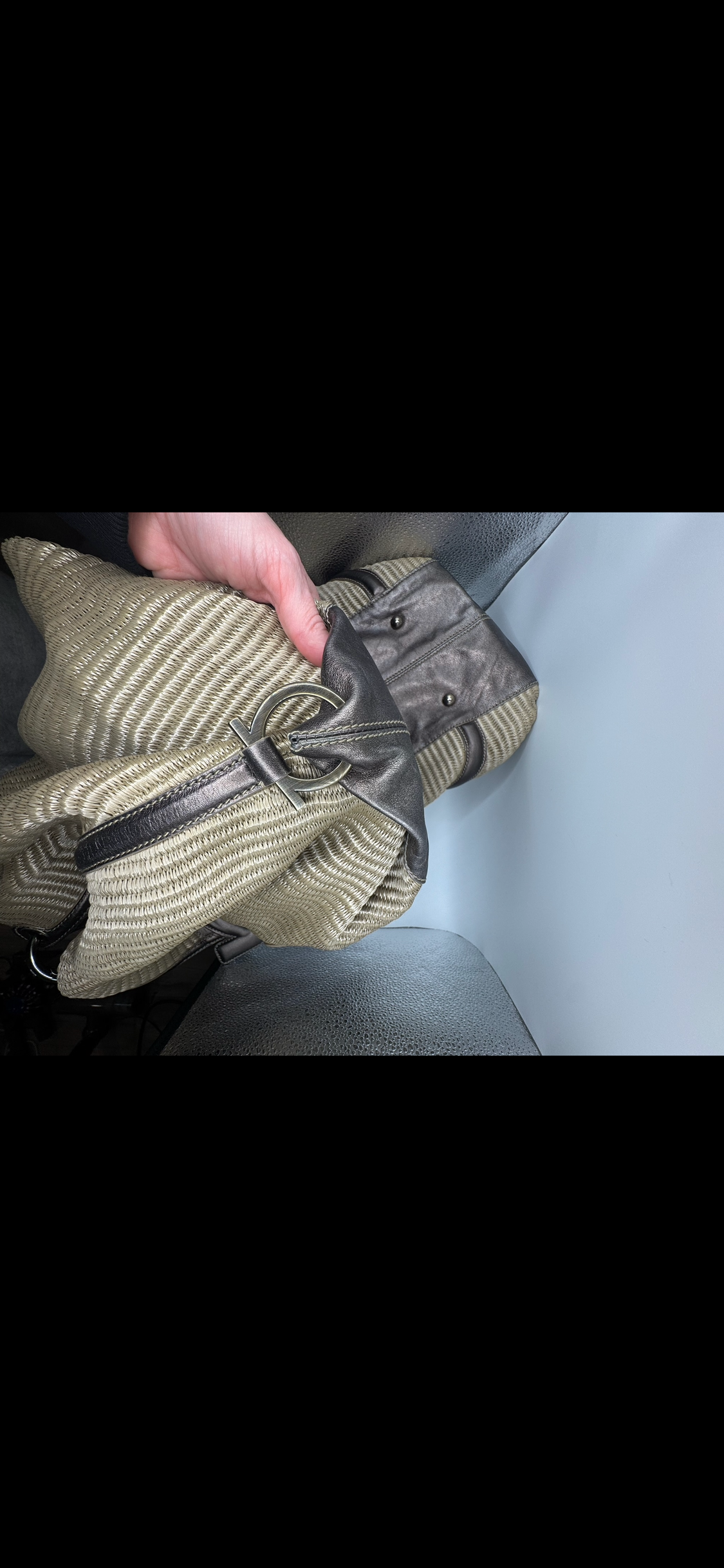 - Material: Woven canvas body with genuine leather trim & circular Gancini-inspired handles